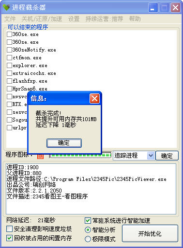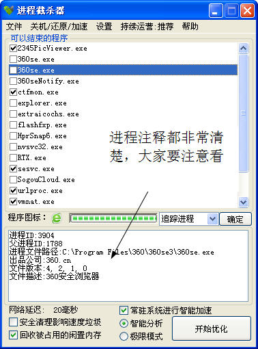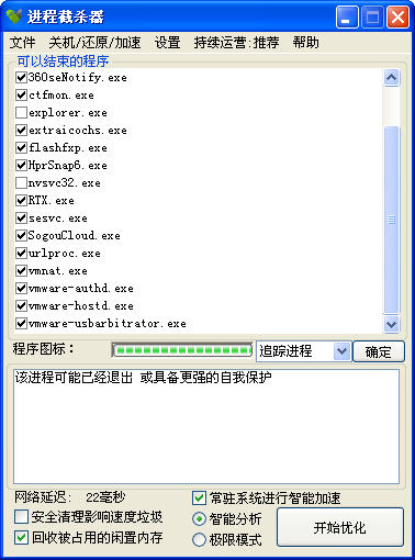 软件会自动忽略系统核心进程.并同时具备"智能分析"与"极限模式"两种模式:智能分析下将会自动分析哪些进程是你不需要的;极限模式则会全部当成是您不需要的全部结束;更是可以保存系统当前状态 随时结束全部没有保存的进程,还您一个高速的电脑