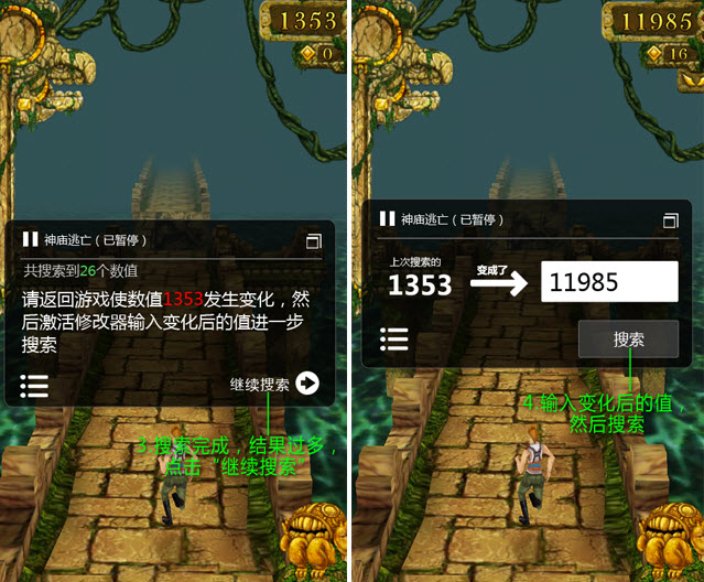 3. 点击“继续搜索”返回游戏,玩一会儿,等到游戏中的属性值变化后再进入到修改器中;