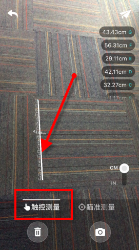 3、西西小编就以坐的椅子底部为例,测量长度,用手指将需要测量的物品从上到下滑动一遍,就可以看到界面白色显示的是测量的具体物品,数据就是测量的结果了