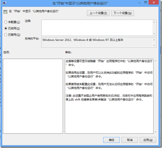 3.双击打开‘在”开始“中显示”以其他身份用户运行“’。默认情况是选中”未配置“,这里选择”已启用“,然后点击”应用“、”确认“。