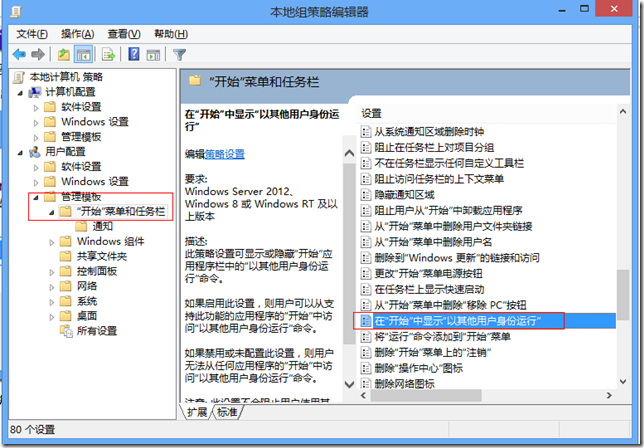2.打开“本地组策略编辑器”后,依次选择:用户配置 -〉管理模版 -〉”开始”菜单和任务栏 -〉在”开始“中显示”以其他身份用户运行“。