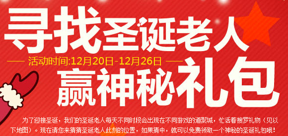 为了迎接圣诞,我们的圣诞老人每天不同时段会出现在不同游戏的道聚城,忙活着搜罗礼物(见以下地图)。现在请您来猜猜圣诞老人此刻的位置,如果猜中,就可以免费领取一个神秘的圣诞礼包哦!