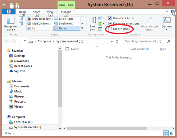 之后你会在资源管理器当中发现一个新分区,打开之后,你可能什么都看不见,勾上显示隐藏项目的那个框,就能看到隐藏的文件了: