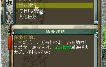 烟花迷情:洛阳(夕阳武士、无名侠女)找两人对话后,放完烟花即可完成