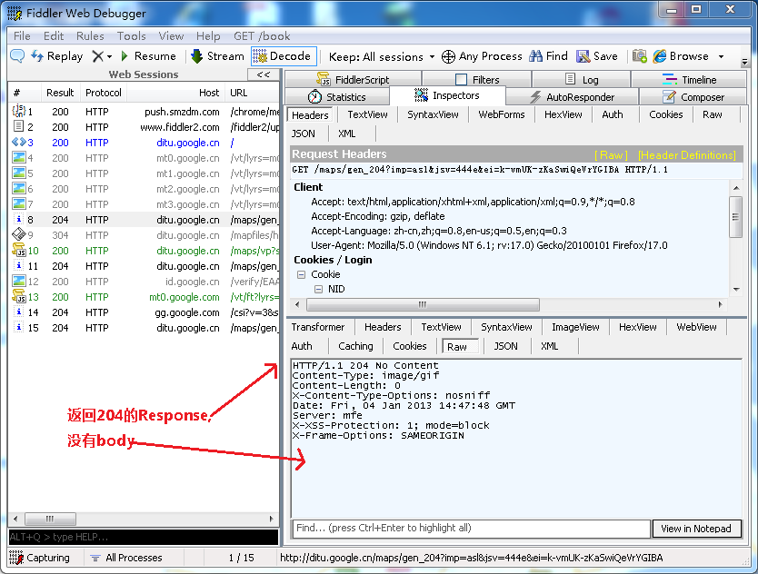 实例:先打开Fiddler, 然后启动浏览器访问ditu.google.cn, 你会捕获到很多204