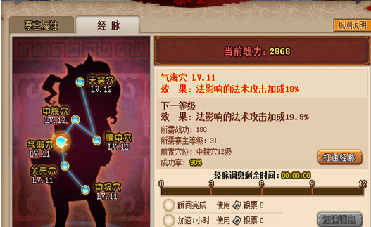 打通经脉需要消耗战功,每打通一次会累计调息时间,当调息时间变为12小时以上后,需要等待时间为0才可以再次打通经脉。经脉级别越高,耗时越长。