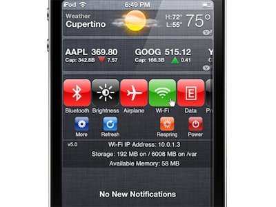 越狱之后,就可以安装非常著名的SBSetting插件了。这个插件可以让你快捷更改手机设置、在通知栏显示各种快捷开关,只要你喜欢,各种开关的组合都可以实现。这样iPhone用户就不用再羡慕Android用户了。