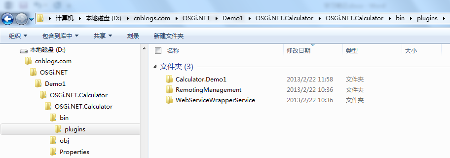 b) 很明显的看出,三个模块的确是被“隔离“在三个不同的文件夹内,且Calculator.Demo1和RemotingManagement、WebServiceWrapperService无依赖,即前者无法知道后两者是否存在,也不需要知道,他们相互不影响。因为我们将Calculator.Demo1放入Plugins目录之前或之后,对于其他两个模块来说,没有什么不同,没有影响他们的功能和作用。同样,我们将RemotingManagement、WebServiceWrapperService移出Plugins目录后,也不会对Calculator.Demo1有影响。