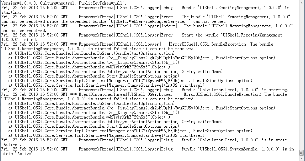c) 但RemotingManagement和WebServiceWrapperService是相互依赖的,WebServiceWrapperService作为一个Web Service包装器向RemotingManagement提供服务,所以RemotingManagement要依赖WebServiceWrapperService。当移掉WebServiceWrapperService之后,RemotingManagement就无法正常启动,OSGi.NET会抛出异常并记录在log.txt中。