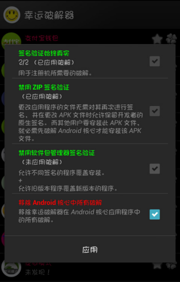重启下手机,再打开幸运破解器的核心破解,勾“移除 Android 核心中所有破解”,按“应用”重启。