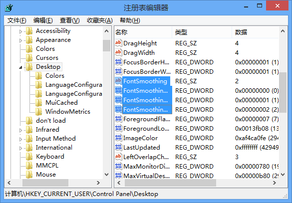 2. 前往注册表 HKCU\Control Panel\Desktop, 在下面,找到四个以 FontSmoothing 开头的键值,分别设置为 2,0,1,2 即可。