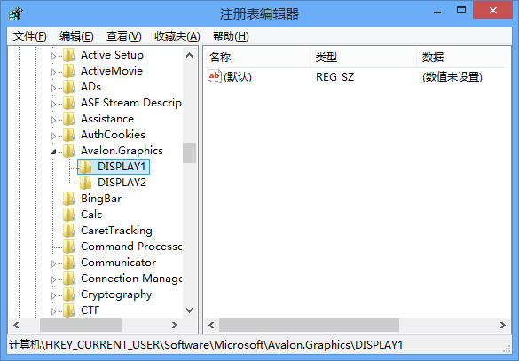 1. 前往注册表 HKCU\Software\Microsoft\Avalon.Graphics,在下面,有几台显示器一般就会有多少个键,分别命名为 DISPLAY1, DISPLAY2, …, DISPLAYn. 我们需要做的,是点击到每一个 DISPLAYx 的键上面,在右侧删除所有的键值(键值"默认"除外)。正常的未进行 ClearType 调谐的样子应该是这样的: