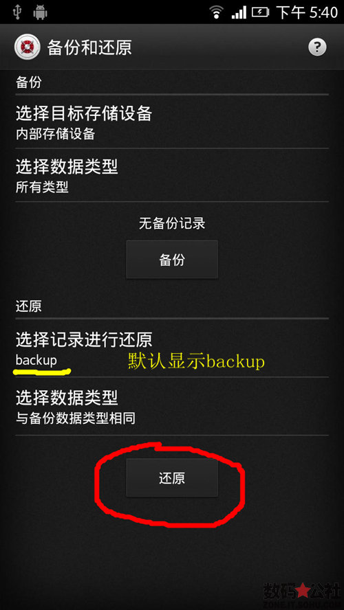 3.看到显示此截图后,请打开手机上的软件【还原与备份】,然后选择【还原】