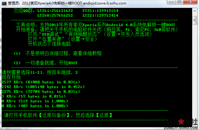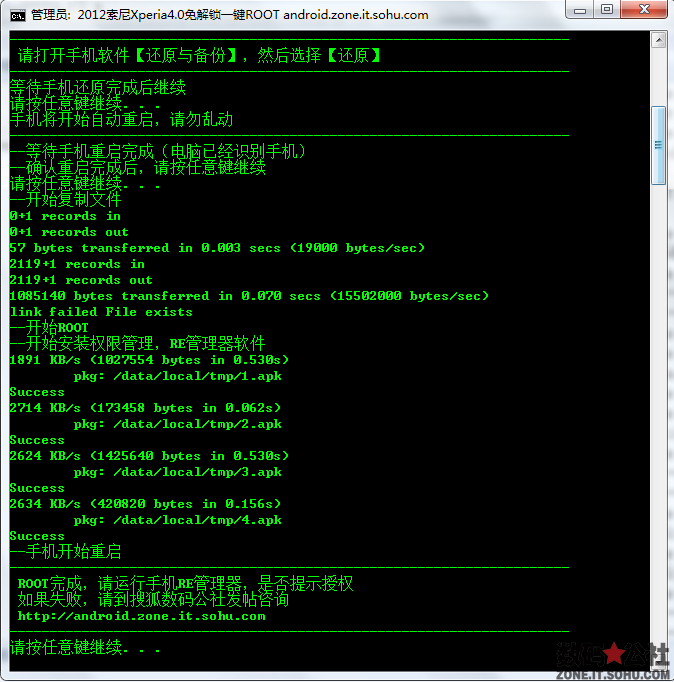 4.等待手机还原完成后,依照ROOT软件的提示,继续按任意键下一步,手机开始重启