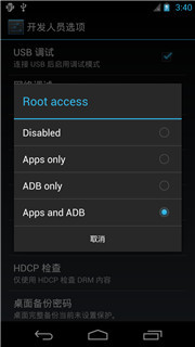 进入设置=》 开发人员选项=>ROOT授权, 在弹出的对话框中选择“应用程序与ADB”,如下图