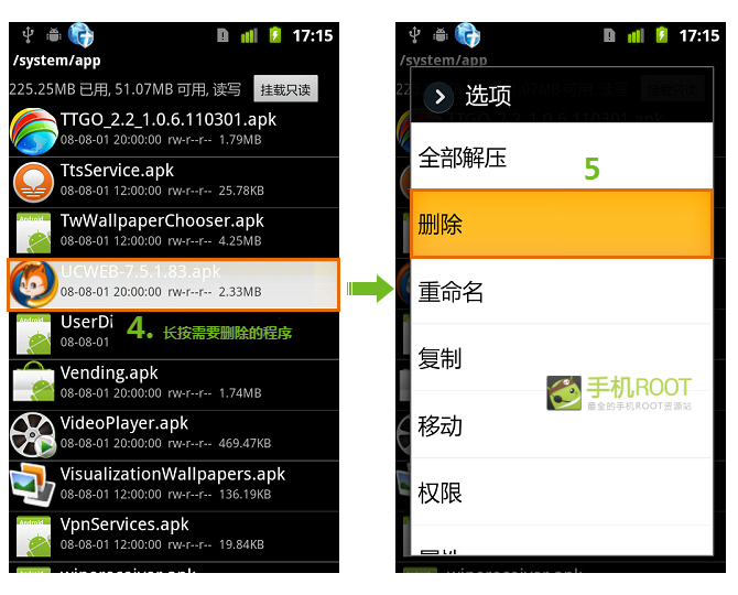 在手机端运行 R.E.管理器 根据下图步骤操作,删除您想删除的软件!