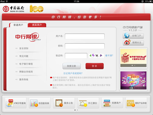 (一)提供丰富的优惠信息和服务资讯:中行网银iPad客户端内置了优惠活动、优惠商户、ATM查询、存贷款利率、外汇牌价、理财产品、基金净值等便捷信息,您无需登录网银也可随时了解最新优惠信息及服务资讯。此外,您还可以通过客户端登录页内的快捷链接,快速访问中国银行全球门户网站和电子银行官方微博。