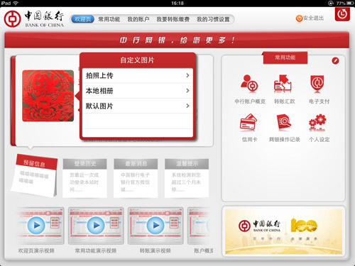 (三)提供多种个性化定制服务:中行网银iPad客户端支持您上传个性头像图片、自定义预留信息及设置常用功能,为您打造个性化移动金融服务。