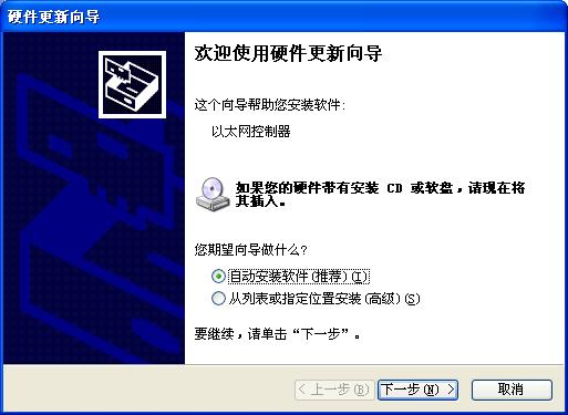 咱们首先可尝试让其自动安装驱动程序,选择“自动安装软件”,然后点“下一步”,如果操作系统里有包含了该设备的驱动程序,操作系统就会自动给其装上,我们也就完成任务。如果没有,就无法安装这个硬件设备了。