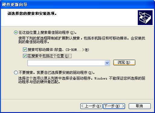 如果驱动程序在光盘或软盘里,在接着在弹出的窗口里把“搜索可移动媒体”勾上就行,如果在硬盘里,则把“在搜索中包括这个位置”前面的复选框勾上,然后点“浏览”。接着找到咱们准备好的驱动程序文件夹,要注意的是很多硬件厂商会把其生产的很多类型的硬件设备驱动都压制在一张盘中,而且还会有不同的操作系统版本,如For Win2K(Win2000)和For WinXP的,要注意选择正确的设备和操作系统版本。点“确定”之后,点击“下一步”就行了。