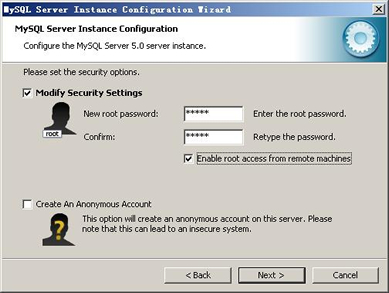 这一步询问是否要修改默认root用户(超级管理)的密码(默认为空),“New root password”如果要修改,就在此填入新密码(如果是重装,并且之前已经设置了密码,在这里更改密码可能会出错,请留空,并将“Modify Security Settings”前面的勾去掉,安装配置完成后另行修改密码),“Confirm(再输一遍)”内再填一次,防止输错。 “Enable root access from remote machines(是否允许root用户在其它的机器上登陆,如果要安全,就不要勾上,如果要方便,就勾上它)”。最后“Create An Anonymous Account(新建一个匿名用户,匿名用户可以连接数据库,不能操作数据,包括查询)”,一般就不用勾了,设置完毕,按“Next”继续。