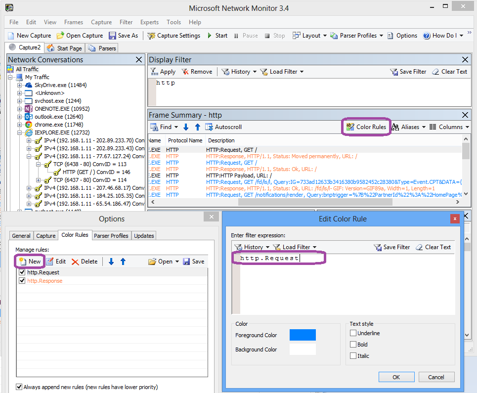 为了使抓包更容易分析查看,可以通过不同的过滤语句设置颜色规则。