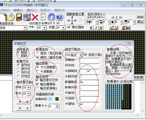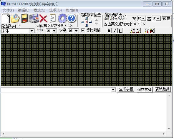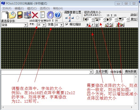 0.使用PCTOLCD的各种调整功能调整出您需要的文字样式,如字体,字样(下划,倾斜,加粗),大小(各种点阵大小的字体,可锁定点阵本身大小(如16*16),然后在这个固定的点阵大小内调节文字的大小(例如在16*16的点阵中居中显示12*12大小的汉字).