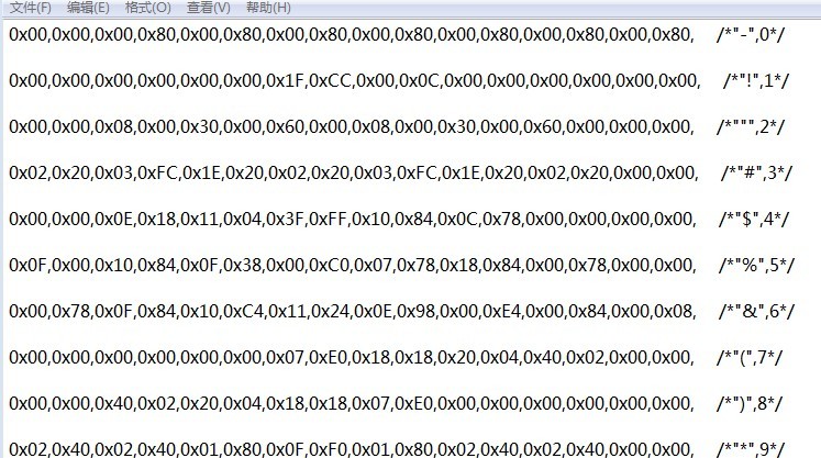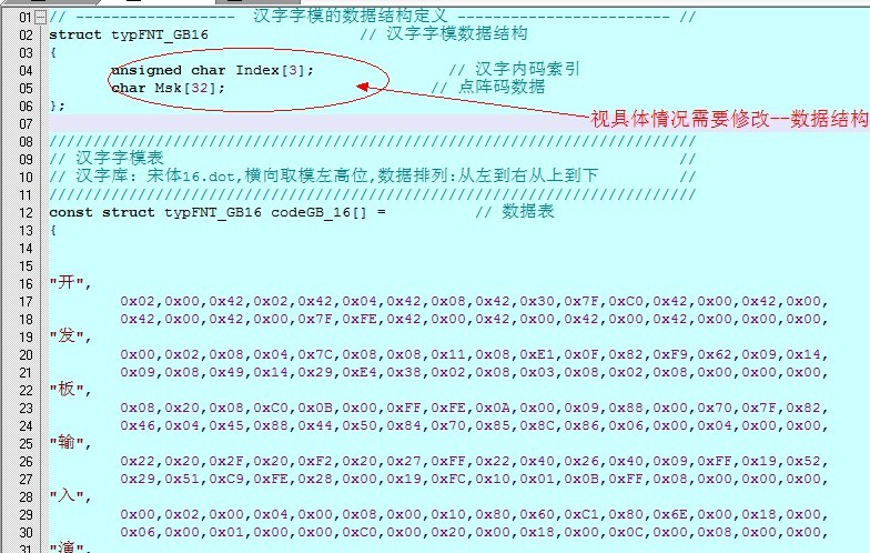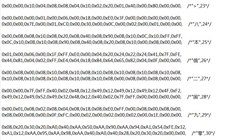 知道了以上信息,可以在检索字模时知道如何编程了。最后如何将字模文件用到头文件里,如下: