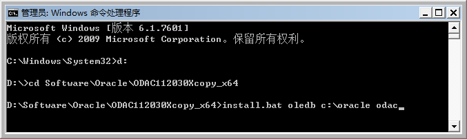 解压并在命令行界面进入解压文件夹,运行“install.bat oledb c:\oracle odac”安装(我们只需要oledb的驱动,并把对应的文件安装到C盘oracle目录下。注意其中的空格)。