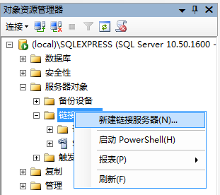 在SQL Server Management Studio中连接到数据库,并在其下的“服务器对象”-“链接服务器”,右键选择“新建链接服务器”。