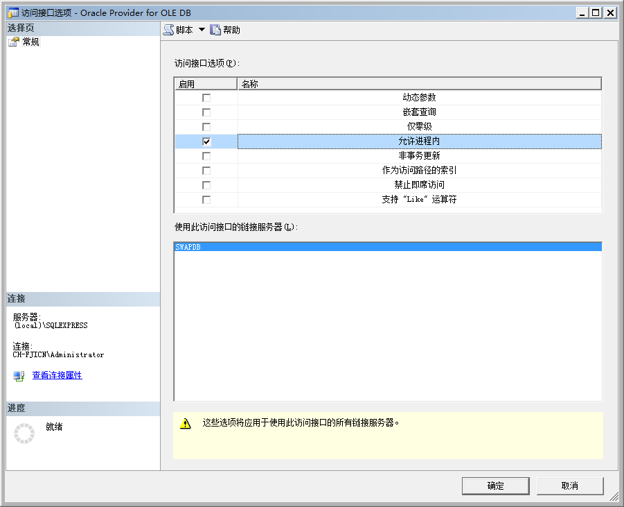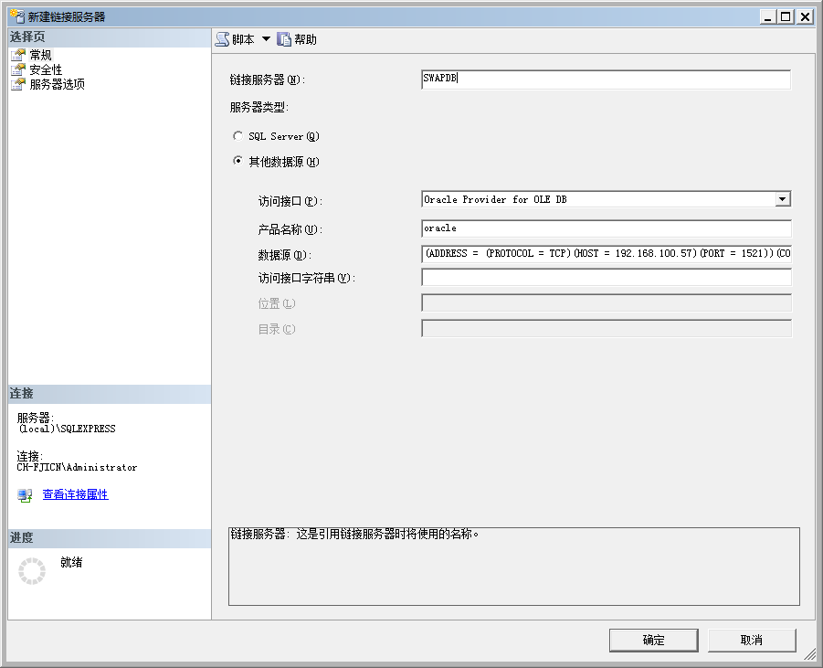 在常规中填入链接服务器名称:SWAPDB、访问接口:Oracle Provider for OLE DB、产品名称:oracle、数据源:(ADDRESS = (PROTOCOL = TCP)(HOST = 192.168.1.2)(PORT = 1521))(CONNECT_DATA = (SERVER = DEDICATED)(SERVICE_NAME = ORACLEDB)))