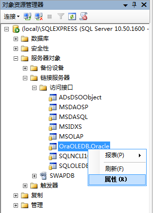 在“服务器对象”-“链接服务器”-“访问接口”-“OraOLEDB.Oracle”,右键选择“属性”。