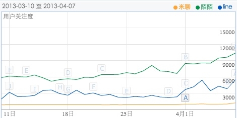 当一群不明真相的群众踊跃的讨论微信收费与否这个命题时,话题感的上升,自然会带来一些产业的附加效应。对资本市场敏感的筒子们,会发现“飞信”重塑概念股神州泰岳(SZ.300002)的股价已经连续涨停两日,对产品略有了解的用户则将微信的替代品推向了前台,从百度指数可以看到,这一周中,米聊的用户关注度同比增43%,陌陌同比增28%,相比之下另一款在日本流行的沟通神器Line的用户关注度则直接大增85%。