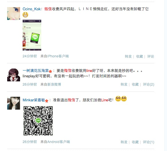 而在微博中,而有许多用户直言“要是微信收费,我们就用Line吧”。更实在的则是,笔者Line中的朋友数在这一周中增加了至少5成。