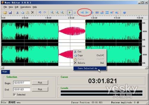 通常的手机铃声,可以为它添加一个淡入淡出效果,这样听起来就不那么生硬。点击工具栏上的“Fade In”图标就可以添加淡入,默认会为你设置好时间,同样点击工具栏上的“Fade Out”图标就可以添加淡出(图2),然后就可以进行试听,满意的话右击鼠标,在弹出的快捷菜单中选择“Save Selected As”,如果手机支持MP3铃声的话,不妨选择格式为MP3,并且设置好比特率,建议选择192以下的值就可以了。否则传到手机上后会有“爆音”现象。确定后即可完成截取了。