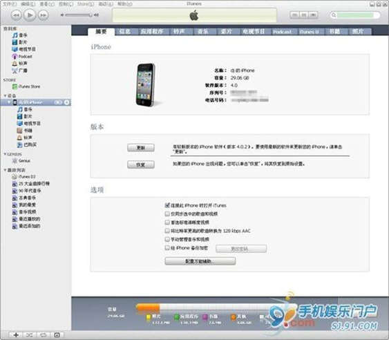 在摘要界面中,可以查看到iPhone的关于信息,包括iPhone名称(iPhone第一次连接iTunes时设置,后期可更改),iPhone容量(用户空间大小),版本(iPhone版本),序列号,电话号码;版本中,“检查更新(更新)”按钮用来对iPhone的固件进行升级(保持iPhone用户空间内的数据),“恢复”按钮可对iPhone进行恢复到原始设置,iPhone内的所有数据会被抹除;