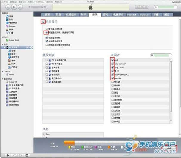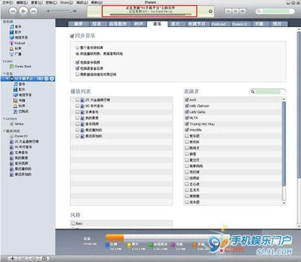 在“音乐”界面中,可同步已经导入到iTunes资料库中的音乐数据;