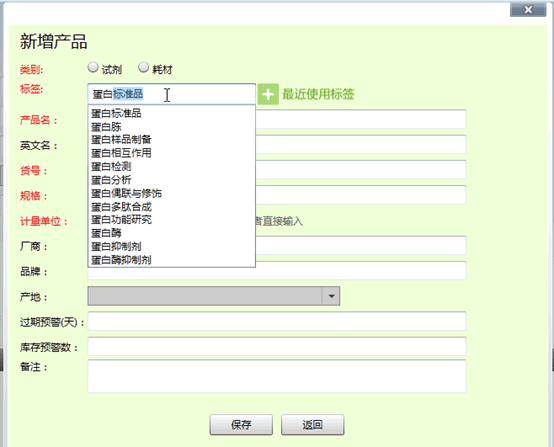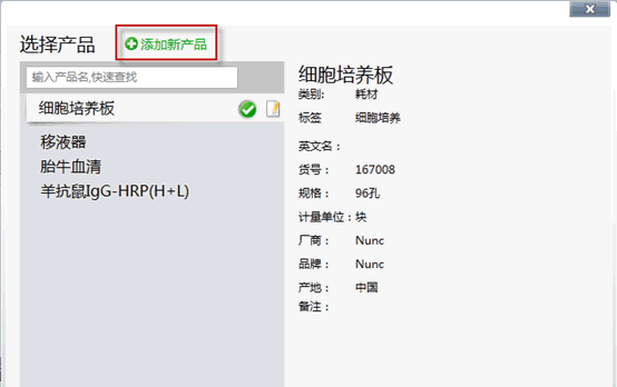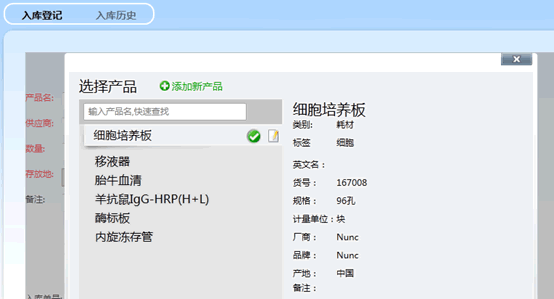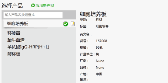 ● 通过左侧标签列表,或产品名,批号筛选可快速找到所需的产品。系统默认显示所有产品。