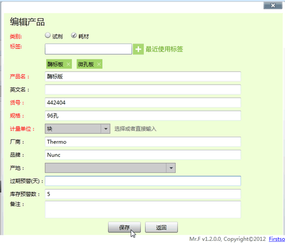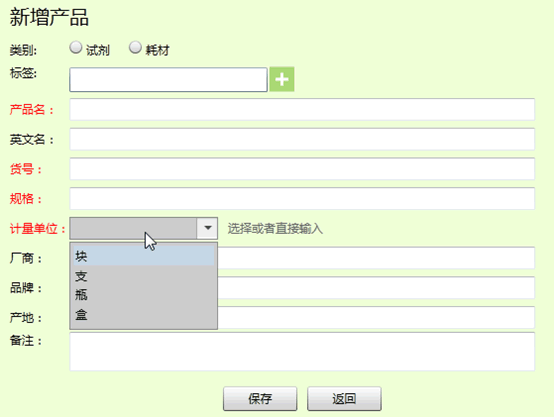 ● 红色标识出的字段是必填项,其他为可选填。填完后点击“保存”即可完成此产品的输入保存。