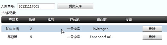 ● 点击“提交入库”,可以将该入库单中的所有产品一次保存入库。
