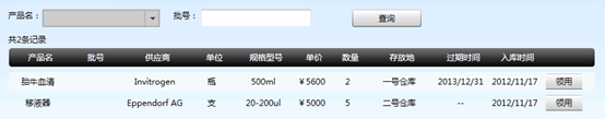 ● 点击记录右侧的“领用”按钮,填写产品领用单。