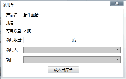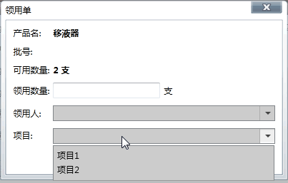 ● 领用单中的领用人和项目可以输入,也可以选择(如果之前输入过)。