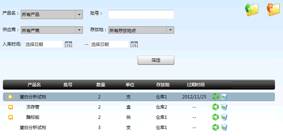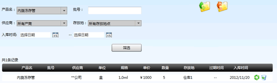 ● 通过左侧标签列表,或产品名,批号等筛选条件可以快速找到相应的产品库存。
