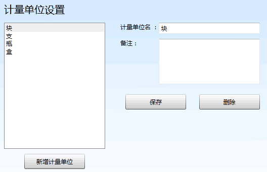 ● 用于登记各类产品的计量单位相关信息,可以进行增,删,改。
