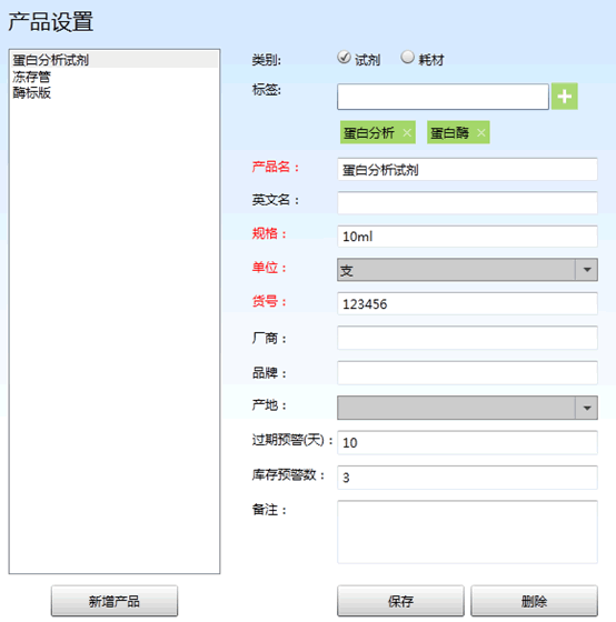 ● 过期预警(天):用于设定该产品的过期预警天数,需要配合入库时选择“过期时间”,当该批次产品离设定的“过期时间”还剩过期预警天数时,系统会自动发送过期提醒警示。