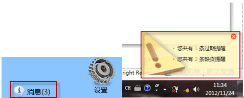 图标,在软件右上角“消息”列表中会显示预警信息,在系统启动时也会显示提示信息。