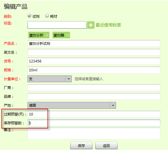 ● 在产品编辑页面可以对库存和过期预警进行设置。