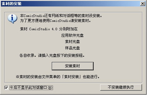1.第一次启动软件时,页面会弹出一个【素材的安装】对话框。单击其左下角【今后不显示此对话窗口】的复选框,然后单击右下角【不安装继续执行】按钮继续。这样做是因为如果软件不是默认安装在C盘,那这个默认的安装素材就会安装失败,所以大家要学会怎样手动安装素材。
