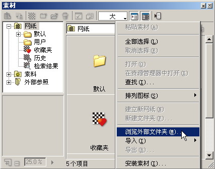 方法1将素材放在软件的安装目录中,是因为软件默认安装在系统的盘符里,一旦重装系统软件的素材就得重新安装,因此为了避免麻烦,大家可以把素材保存到电脑的其它盘中,如保存在E盘中:在Comic Studio中单击键盘F6显示【素材】面板,单击窗口右上的“黑三角”显示选项菜单,单击【浏览外部文件夹】选项进行设置。