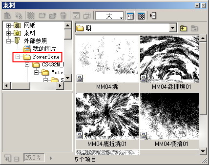 在【素材】窗口的左上小窗口中展开【外部参照】目录,可以找到刚添加的素材链接。将右侧的网点图案拖拽到页面上即可使用与编辑。